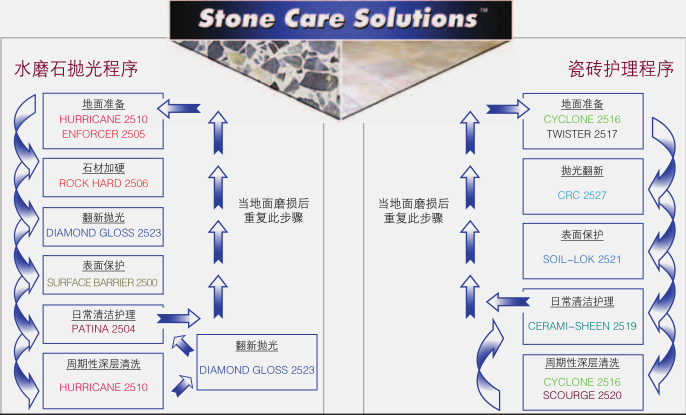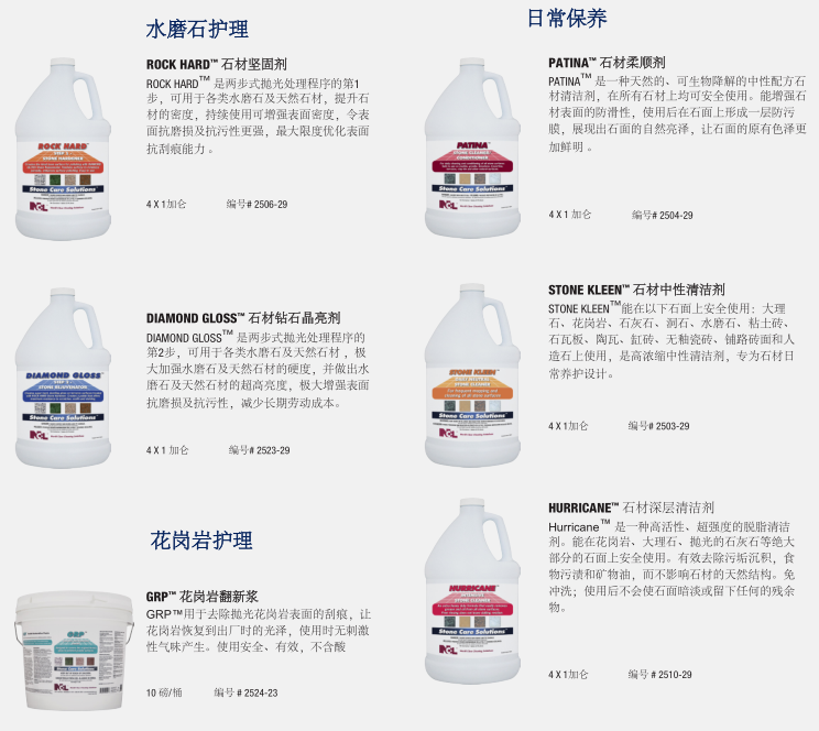 NCL的石材护理系统™对天然石材和陶瓷表面光泽的保持维护和修复是一个完整的、专业的系统。这种协调的系统在保持和修复天然石材地面,台面保持高光泽度的同时防止表面的污渍侵蚀。50多年来NCL 生产了卫生维护专业人士信任的高质量以及高性能的产品。在NCL,我们所有的创新的产品和杰出表现的系统设计的发展方向是节省您的时间,劳动强度和费用。石材护理系统™为您提供任何天然石材或瓷砖表面高性能安全,专用维护产品。这个全面的计划是专为建筑服务承包商和内部设施服务提供商设计,并不需要多年的技术经验与研磨方法!
